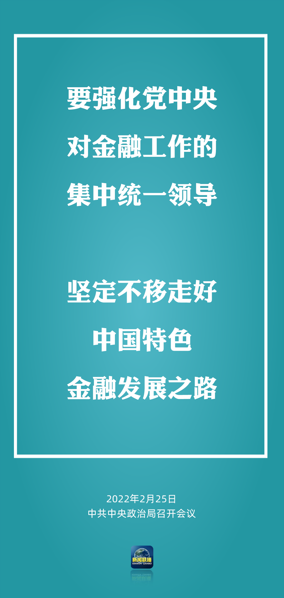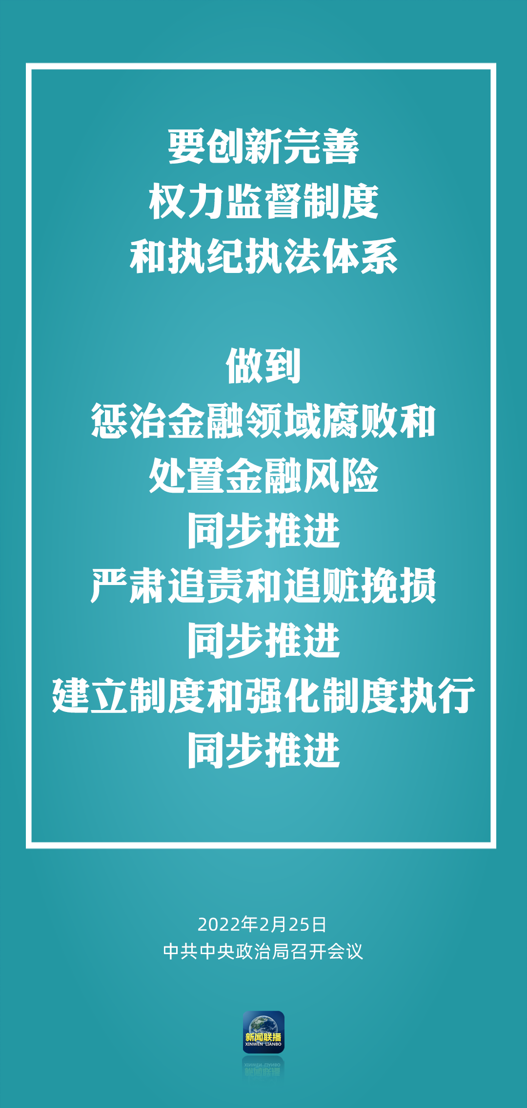 会议强调,要强化党中央对金融工作的集中统一领导,坚定不移走好中国特色金融发展之路。要强化金融风险防控,坚决维护金融稳定大局。要强化全面从严治党严的氛围,落实“两个责任”,加强对“一把手”和领导班子的监督,对违反中央八项规定精神、政商“旋转门”等典型共性问题开展专项整治,一体推进不敢腐、不能腐、不想腐。要创新完善权力监督制度和执纪执法体系,做到惩治金融领域腐败和处置金融风险同步推进、严肃追责和追赃挽损同步推进、建立制度和强化制度执行同步推进。要深入贯彻新时代党的组织路线,强化领导班子队伍建设。要深入推进金融领域改革,不断提高金融治理体系和治理能力现代化水平。