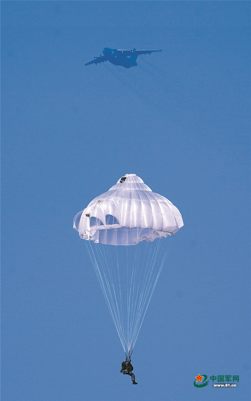 “跳!跳!跳!”离机信号响起,跳伞员接连跃出机舱,空中顿时绽放出朵朵伞花。与此同时,蓝军分队在预定地域展开防御,一场要点夺控战斗随即打响。