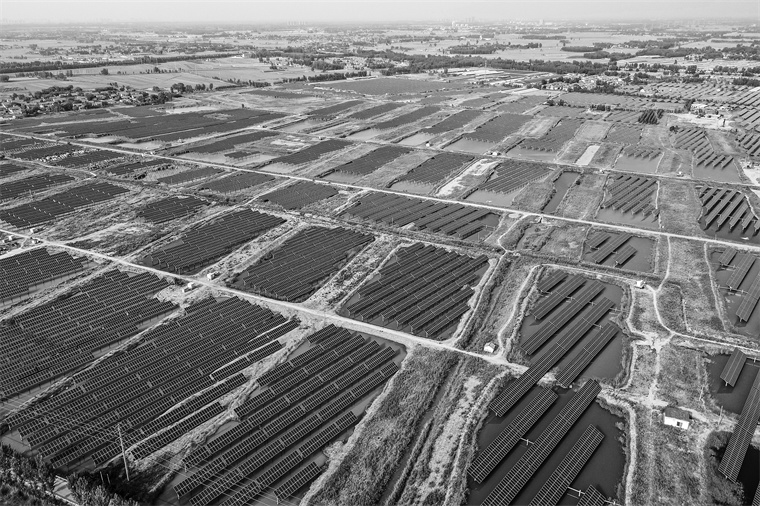 山东省高青县利用盐碱荒地打造水上光伏发电、水下特色养殖的立体化“渔光互补模式”,助力碳中和,推进乡村振兴。新华社记者 朱 峥摄