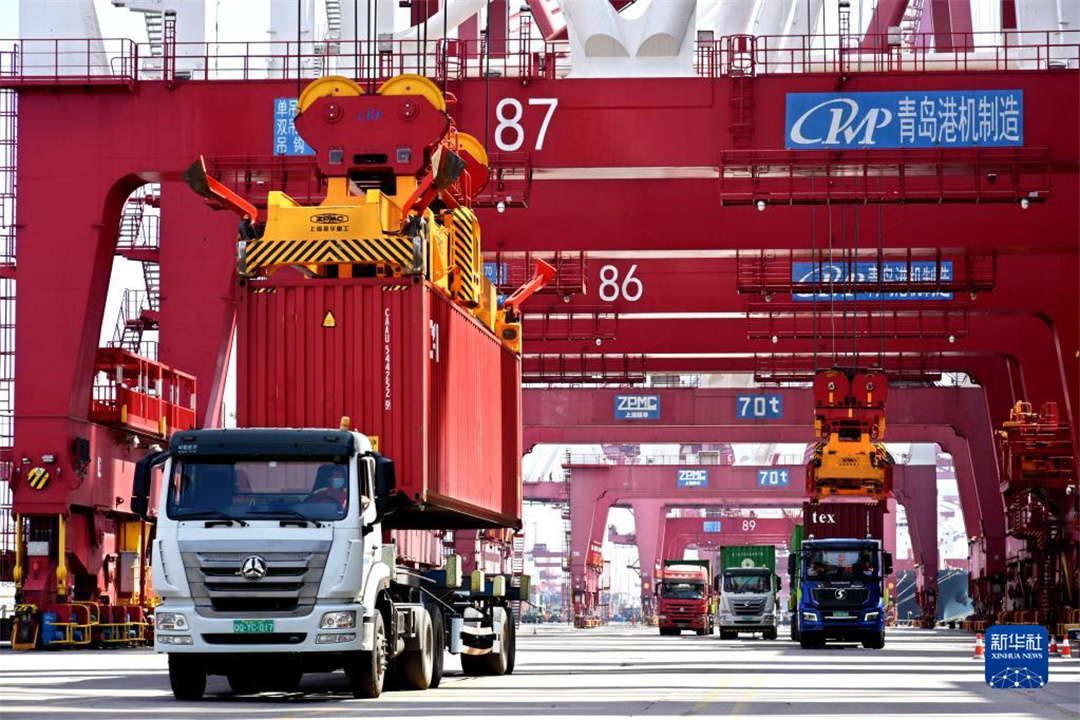 山东港口青岛港前湾港区,集装箱被吊上货轮(6月15日摄)。青岛海关数据显示,今年1月至5月,青岛直达金砖国家的航线共完成箱量83万标箱,同比增长12%,其中出口量增长26.1%。新华社记者 李紫恒 摄