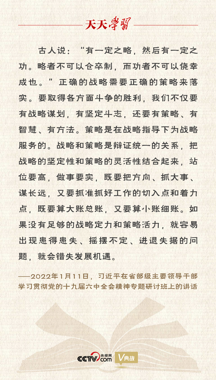 战略问题是一个政党、一个国家的根本性问题,正确的战略需要正确的策略来落实。2022年1月11日,在省部级主要领导干部学习贯彻党的十九届六中全会精神专题研讨班上,习近平总书记引用上述古语强调:“把战略的坚定性和策略的灵活性结合起来,站位要高,做事要实,既要把方向、抓大事、谋长远,又要抓准抓好工作的切入点和着力点,既要算大账总账,又要算小账细账。”为我们在解决突出问题中实现战略突破、在把握战略全局中推进各项工作提供了根本遵循。