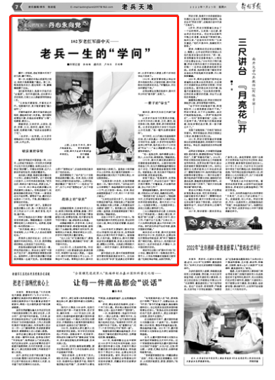 离休后的40年里,薛中天坚持到南京市各中小学、党政机关、企事业单位开展革命传统宣讲,将“种子”播撒到更广阔的天地。面对众人,他无数次讲起自己一生求学的追求:不懈奋斗,为中国的明天而学。