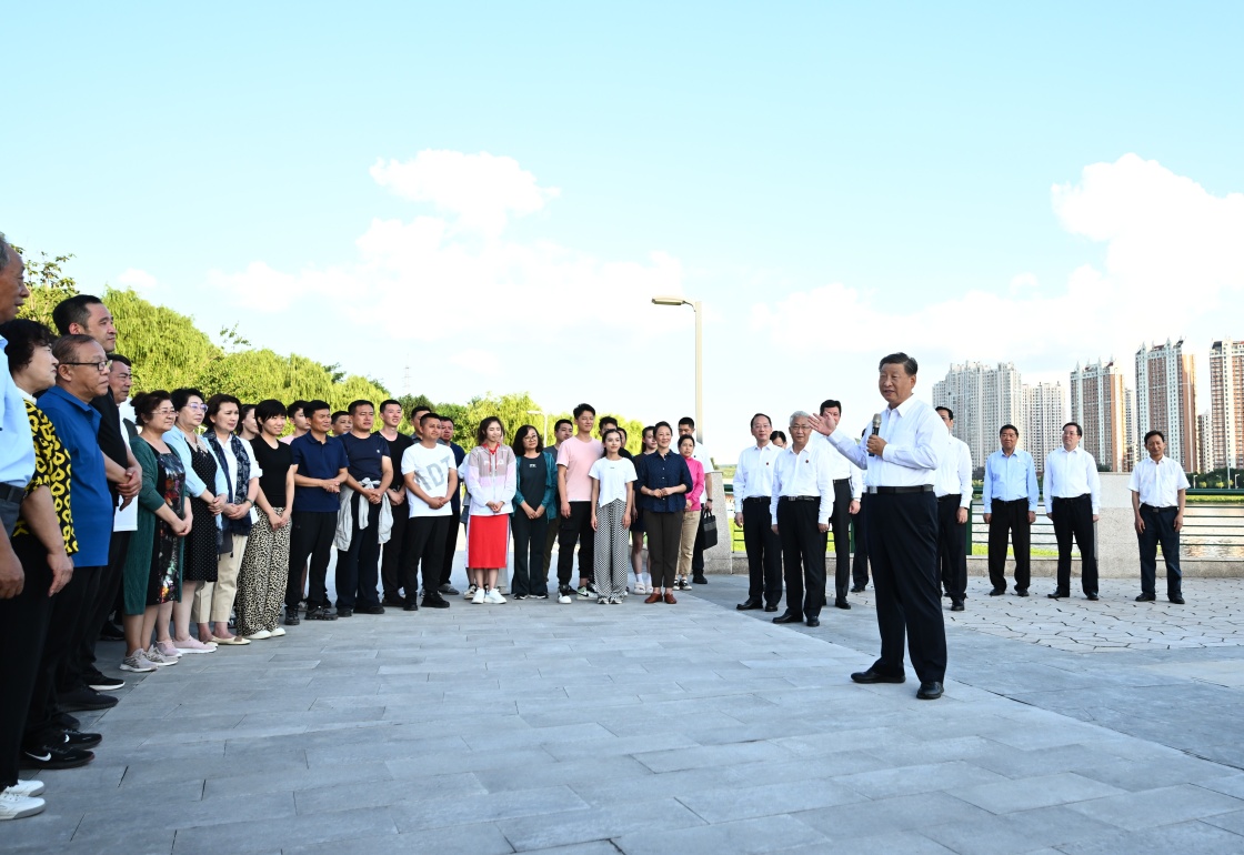 8月16日至17日,中共中央总书记、国家主席、中央军委主席习近平在辽宁考察。这是16日下午,习近平在锦州市东湖森林公园察看小凌河沿岸生态环境时,同正在休闲、进行文化活动的群众亲切交流。新华社记者 燕雁 摄