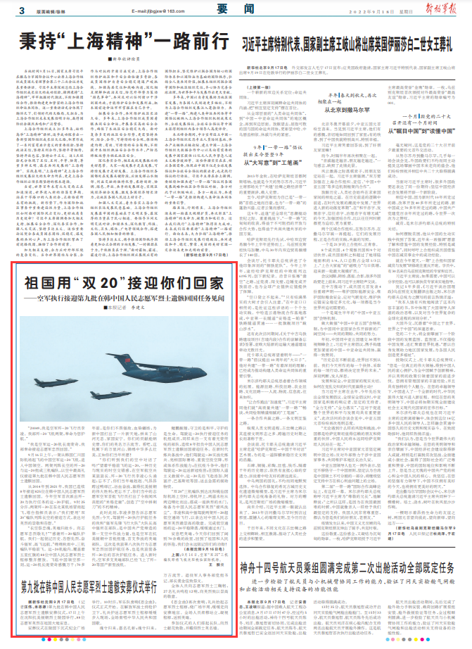 “长空祭忠魂,英雄归故乡。向志愿军忠烈敬礼!”“感谢歼-20编队护航。我们一起铭记历史、告慰先烈,奋斗强军、高飞远航。”绵绵秋雨中,三机编队平稳前飞。运-20机舱内,覆盖着五星红旗的88位中国人民志愿军烈士棺椁整齐摆放。飞临中国领空那一刻,运-20机长庞荣奇感慨万千:70多年前,是你们不畏强敌、血染疆场,为新中国打出了一片新天地,拼来了山河无恙、家国安宁。你们的贡献彪炳史册,你们的英名万古流芳。看吧,这机翼下的万里河山、锦绣中华多么壮美,正如你们当年所愿!