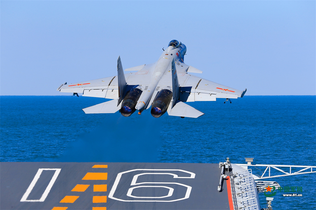 图为海军舰载航空兵某部飞行员驾驶战机滑跃起飞,奔赴目标空域开展实战化训练。王园林摄