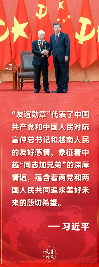 这是中共二十大胜利召开之后中方首次接待外方领导人来华访问。双方领导人畅叙两党两国传统友谊和发展前景。习近平总书记向阮富仲授予中华人民共和国“友谊勋章”,并举行隆重颁授仪式。