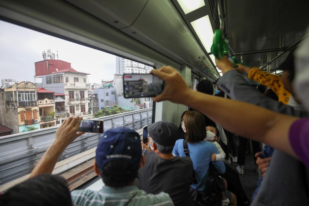 市民在越南首都河内的轻轨列车上拍照体验。新华社/越通社