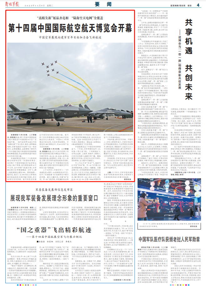 解放军报珠海11月8日电 记者李建文、李浩然报道:第十四届中国国际航空航天博览会(中国航展)8日在广东珠海开幕。一批代表世界先进水平的“高精尖新”产品、技术、服务、成果集体亮相,实现“陆海空天电网”六位一体系统化、全维度覆盖,全面展现了新时代十年中国航空航天和国防科技领域取得的辉煌成就,向全球持续传递开放自信合作的中国力量。