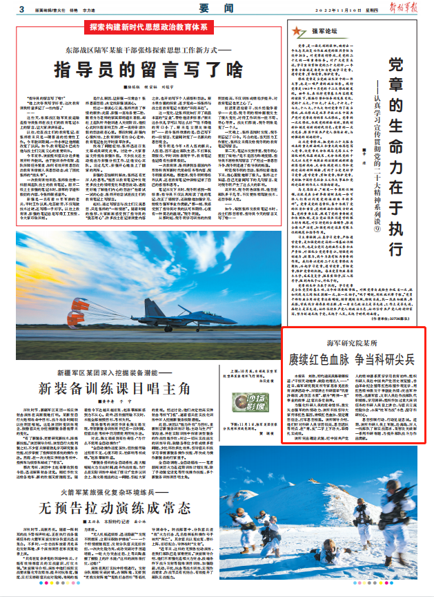 该所突出理论武装,把中国共产党人的精神谱系贯穿学习教育始终,组织科研人员赴中国共产党历史展览馆、香山革命纪念馆等红色场馆参观见学,用红色精神激发干事创业热情;突出军种特色,选派军官、文职人员赴作战部队代职锻炼、学习调研;组织参加过重大演训任务的科研人员登上讲台,与官兵交流经验体会,永葆“姓军为战”本色、坚守科研初心。