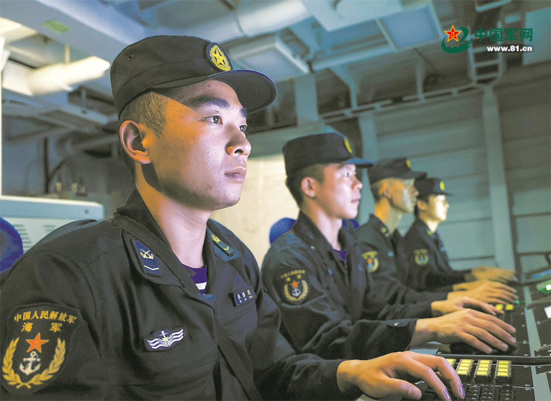 编队机动途中,反潜部门根据指令布放声呐,舰载直升机即刻升空对相关海域展开搜索。舰艇作战指挥室内,口令声、键盘敲击声此起彼伏,各战位紧张有序展开行动。