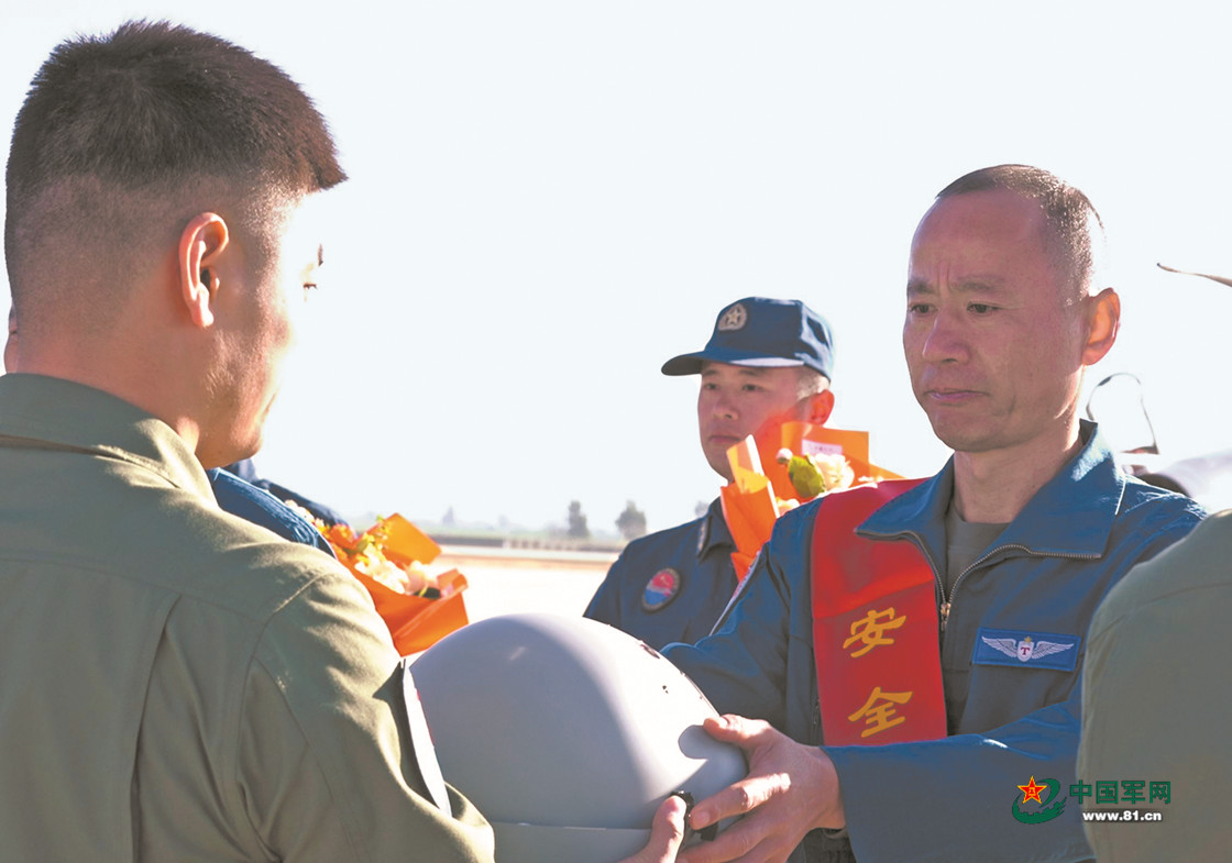 老飞行员马存贤(右)将飞行头盔郑重交给飞行学员。