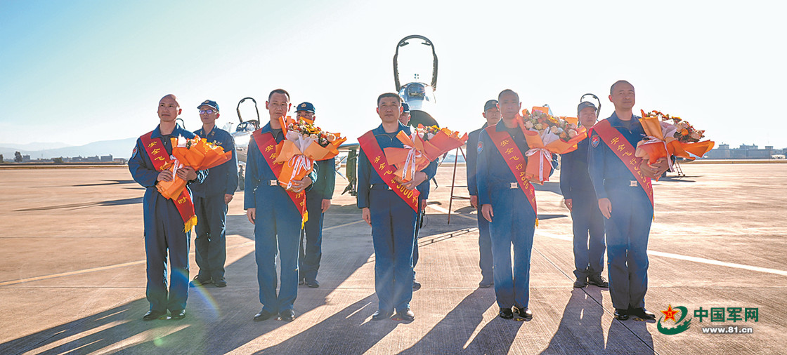 上午9时,停飞仪式在雄壮的《中国人民解放军军歌》声中拉开帷幕。5名特级飞行员陈军、姚立东、马存贤、陈曙光、周伟身着飞行服,佩戴印有各自安全飞行时长的红绶带走向战鹰,向陪伴自己翱翔蓝天的亲密“战友”告别。曾驾机安全飞行5160小时的飞行员周伟,手抚战机凝望许久,脸上流露出依依不舍的神情。