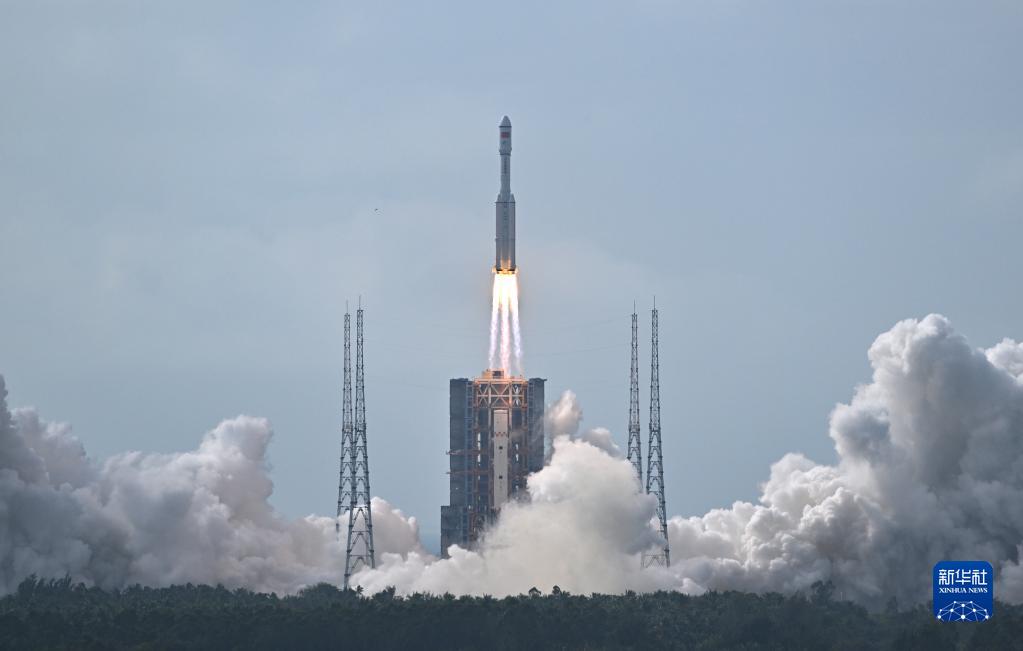 2022年11月12日10时03分,搭载着天舟五号货运飞船的长征七号遥六运载火箭在我国文昌航天发射场准时点火发射,约10分钟后,船箭成功分离并进入预定轨道,飞船太阳能帆板顺利展开工作,发射取得圆满成功。新华社记者 郭程 摄