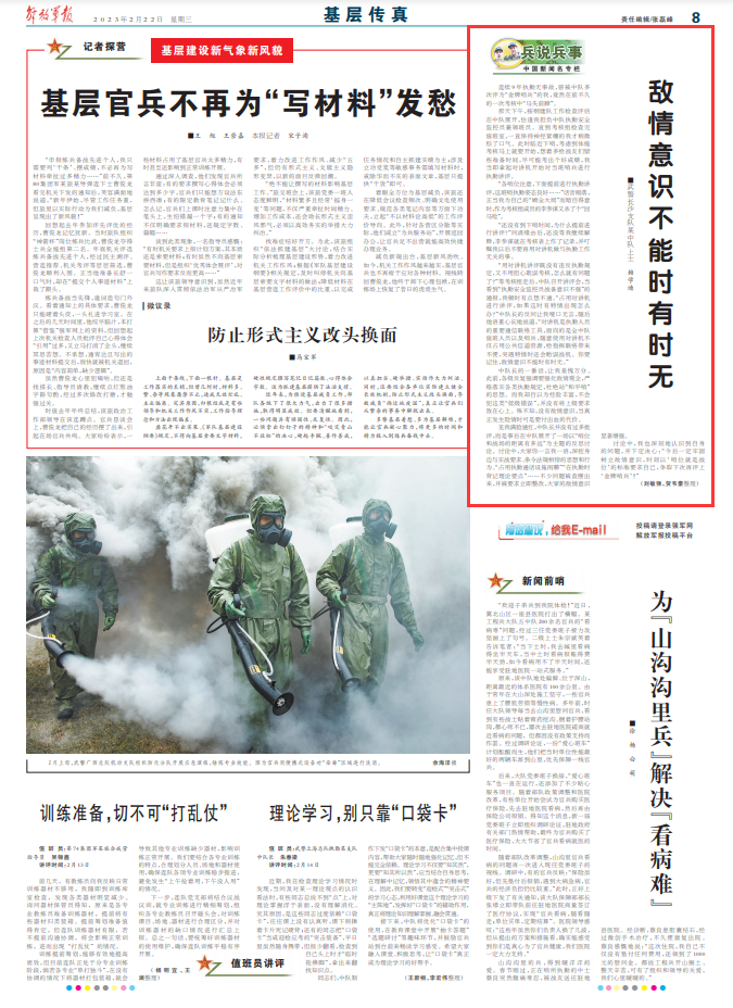 见我满脸通红,中队长并没有过多批评,而是事后在中队展开了一场以“哨位和战场的距离有多远”为主题的反思讨论。讨论中,大家你一言我一语,深挖身边与实战要求、条令法规相悖的思想和行为。“占用执勤通话设施闲聊”“在执勤时背记理论要点”……不少问题被查摆出来,并被要求立即整改,大家的敌情意识显著增强。