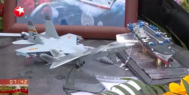 摆放在王伟墓前的战机和航母模型。图片来自网络