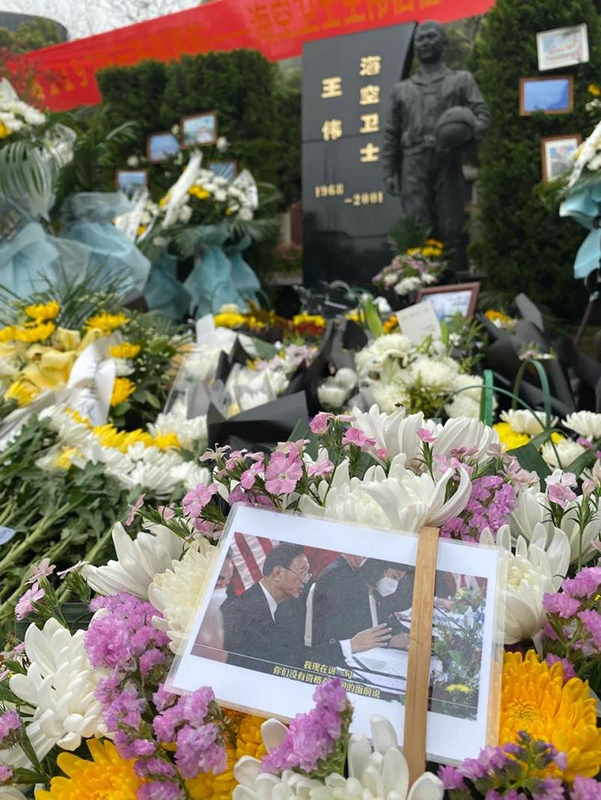 浙江安贤陵园。今年的4月1日是烈士王伟牺牲20周年。陵园工作人员称,3月30日起王伟烈士墓前除了好多好多鲜花,还多了“歼15”和航母模型。这好多的鲜花,有的是附近民众自发祭奠王伟时留下的,还有不少是外地民众托快递小哥送来的。
