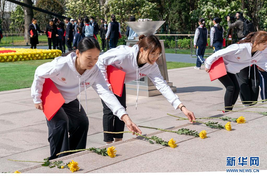 4月4日,参加祭扫活动的学生在龙华革命烈士纪念地献花。新华社记者 王翔 摄