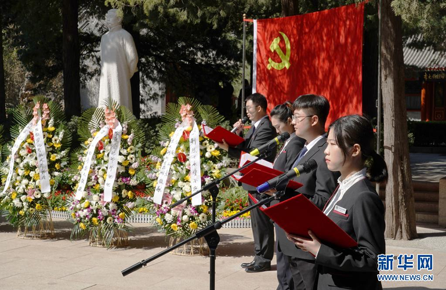4月4日,在北京市万安公墓内的李大钊烈士陵园,工作人员在“缅怀革命先烈 传承红色基因”清明共祭活动中表演情景朗诵《李大钊的青春人生》。新华社记者 任超 摄