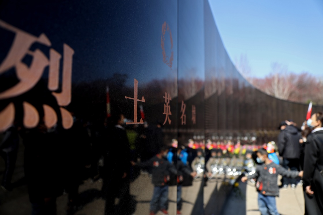 4月4日,祭扫者在沈阳抗美援朝烈士陵园烈士英名墙前瞻仰祭拜。
