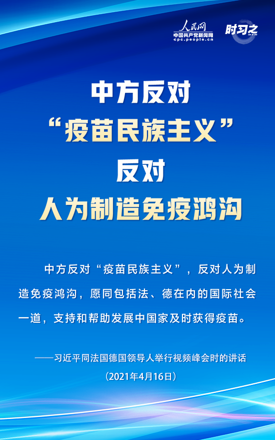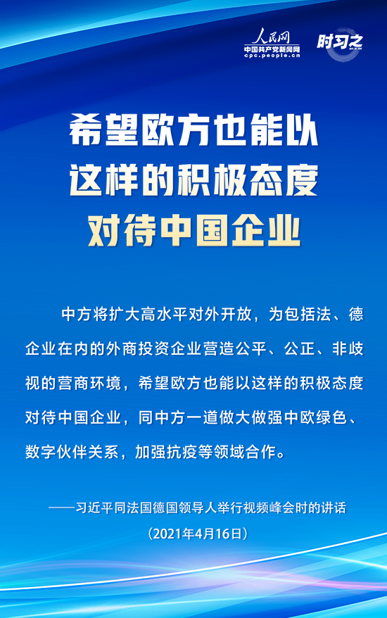 【编者按】4月16日下午,国家主席习近平在北京同法国总统马克龙、德国总理默克尔举行中法德领导人视频峰会。三国领导人就合作应对气候变化、中欧关系、抗疫合作以及重大国际和地区问题深入交换意见。人民网·中国共产党新闻网“时习之”栏目摘录了习近平在这次视频峰会上的重要讲话内容,一起学习。