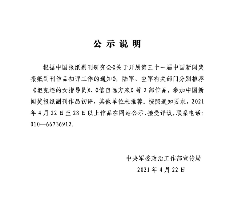 中央军委政治工作部宣传局第三十一届中国新闻奖推荐参加初评作品公示(报纸副刊)