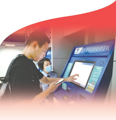 2020年10月27日,广州公安机关工作人员在帮助市民使用居民身份证自助领证机。新华社发
