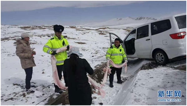 △ 海拔5231米的唐古拉山口,是全国海拔最高的交警执勤点,也是1989年出生的达瓦云旦常年安营扎寨的“家”。作为西藏那曲市安多县的一名交警,他在承担了80%以上进藏物资运输的国道109线上已经工作9年了,时刻守护着青藏公路这条“生命线”,让人民群众在恶劣的自然环境下安全通行。图为达瓦云旦(左二)在安多县扎仁镇境内路段疏导交通,救助车辆(2020年3月摄)。 新华社发