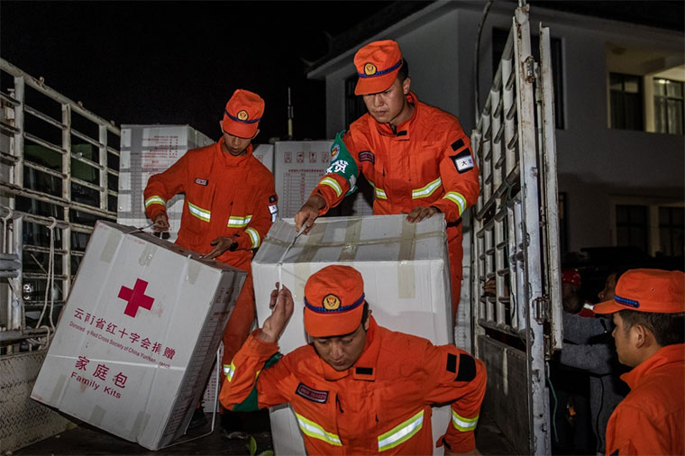 △ 5月22日,在云南漾濞地震灾区,消防官兵搬运救灾物资。 新华社记者 胡超 摄