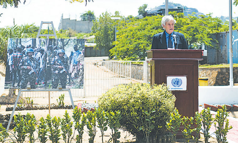 △ 在第19个联合国国际维和人员日到来之际,联南苏团举行活动纪念在南苏丹维和任务中殉职的维和人员,联合国秘书长特别代表发表讲话。 姜慧鑫摄