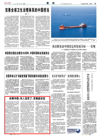 《华尔街日报》5月23日刊登报道,以得自所谓“匿名官员”的信息重新炒作新冠病毒溯源这个老话题,与白宫政客“唱双簧”,妄图嫁祸他人,为美国国内矛盾转移视线。