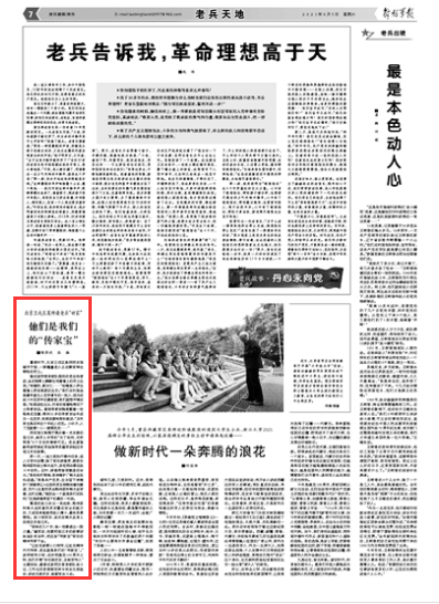 “让红色故事心口相传,让红色精神代代传承,老兵就是我们的‘传家宝’。”该师领导介绍,在庆祝建党100周年之际,他们开展“学光荣历史,当铁军传人”主题活动,邀请在该师及前身部队战斗过、工作过的老前辈回来与官兵交流座谈,讲述光荣历史,砥砺官兵斗志。