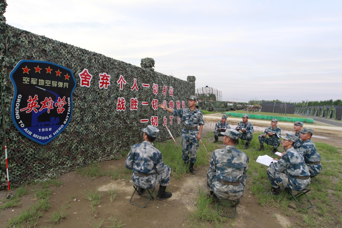 中部战区空军地空导弹某旅“英雄营”教导员袁天姣(站立者)为官兵讲述“英雄营”精神(2020年8月20日摄)。新华社发(刘川 摄)