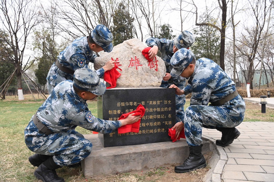 中部战区空军地空导弹某旅“英雄营”官兵在擦拭“英雄树”石碑(4月1日摄)。新华社发(刘川 摄)