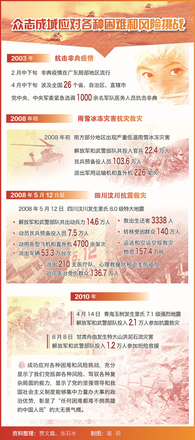 人民有难,军队当先。人民军队素有勇挑重担、能打硬仗的优良作风,是“集中力量办大事”的一支重要力量。尤其在重大灾难、重大险情、重大挑战面前,人民子弟兵总是临危受命、冲锋在前,不负重托、不辱使命。非典疫情肆虐,紧急抽组人员奔赴一线、生死驰援;雨雪冰冻骤降,迅速投入兵力战风斗雪、连续鏖战;汶川地震突发,调动各方力量昼夜奋战、生命接力……不论前面横亘着多么巨大的困难,不论面临着多么严峻的挑战,人民军队都全力以赴、舍生忘死,坚决完成党和人民赋予的各项使命任务。事实证明,只要军民同心、军政团结,风雨同舟、众志成城,就没有克服不了的困难,就没有战胜不了的敌人。