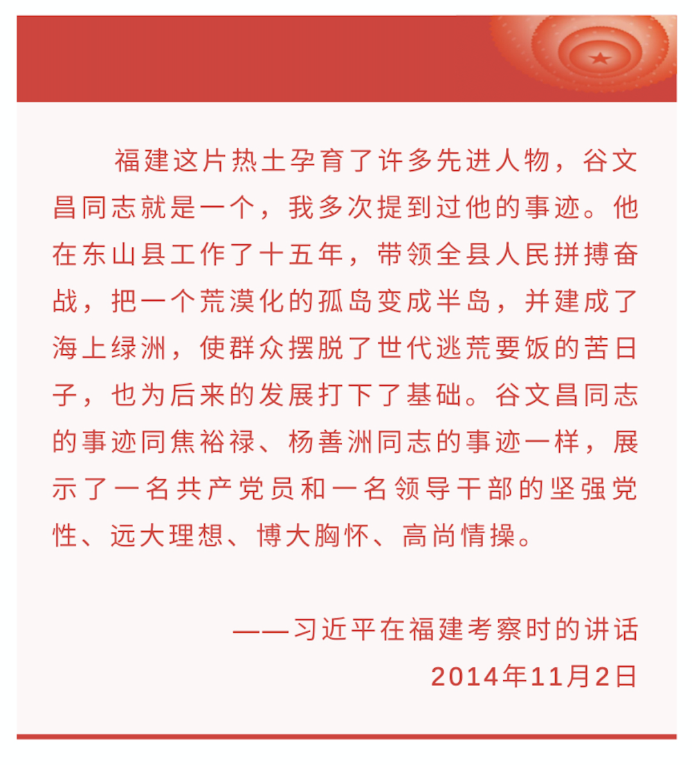 今日的东山岛,绿化率达94%以上,是“国家生态县”。在东山奋斗了14年的老县委书记谷文昌,长眠于岛上赤山林场的木麻黄树旁。感念谷文昌的东山人民,每年清明“先拜谷公,再祭祖宗”。