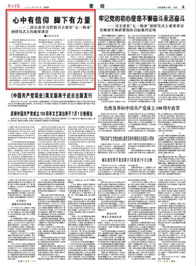 行源于心,力源于志。崇高理想信念是人民军队勇往直前的精神力量,是全军将士心中熊熊燃烧的火炬。全军官兵特别是党员干部要深入学习贯彻习主席重要讲话精神,把对马克思主义的信仰、对中国特色社会主义的信念作为毕生追求,永远信党爱党为党,在各自岗位上顽强拼搏,不断把为崇高理想奋斗的实践推向前进。要以受到表彰的“七一勋章”获得者为榜样,牢记初心使命,坚定信仰信念,强化理论武装,赓续红色基因,始终坚守共产党人、革命军人的精神高地,更好地肩负起党和人民赋予的新时代使命任务。