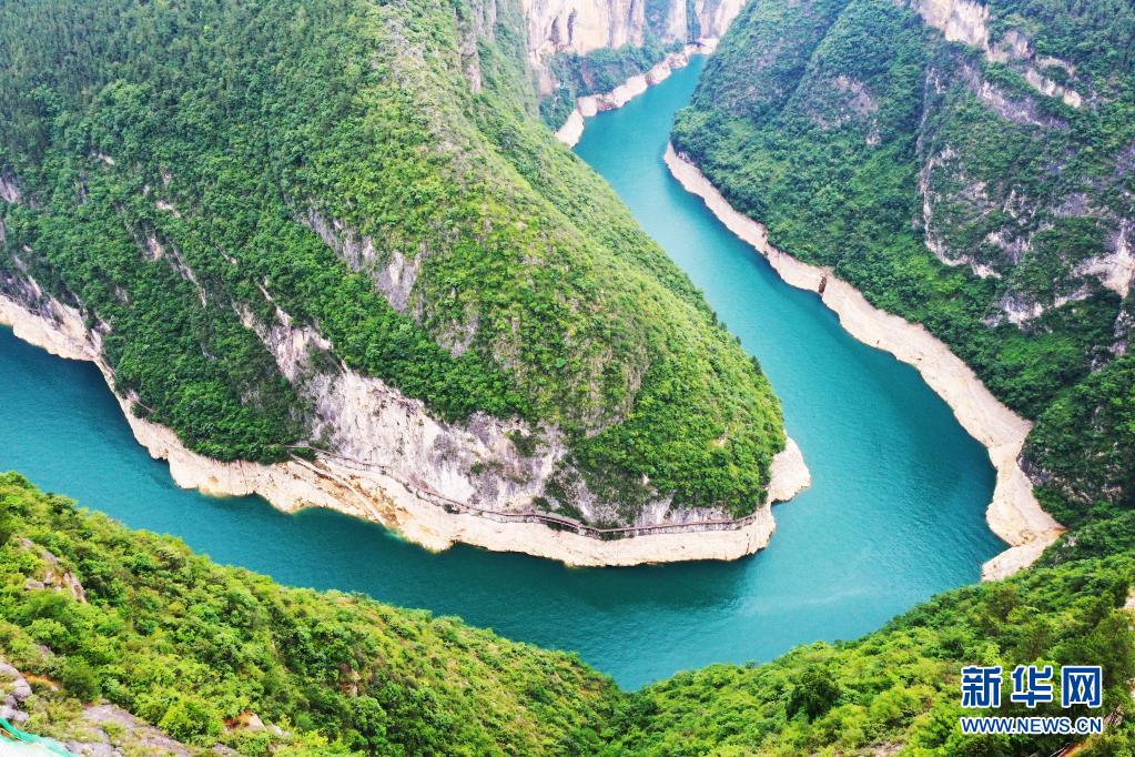 重庆市巫山县鱼头湾景象(2020年5月26日摄,无人机照片)。长江经济带沿江11省市大力推进生态环境整治,“共抓大保护、不搞大开发”,共同舞动高质量发展的“绿色长龙”。新华社记者 王全超 摄