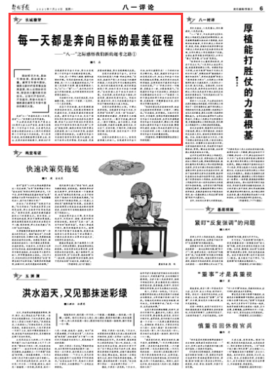 目标昭示方向,目标引领发展,目标凝聚力量。建军百年奋斗目标,铺展出新时代强军事业发展蓝图,给人以目标的召唤、奋进的力量和责任的担当。让我们不负时代,不负韶华,用奋斗和实干铺就通往建军百年奋斗目标的康庄大道。