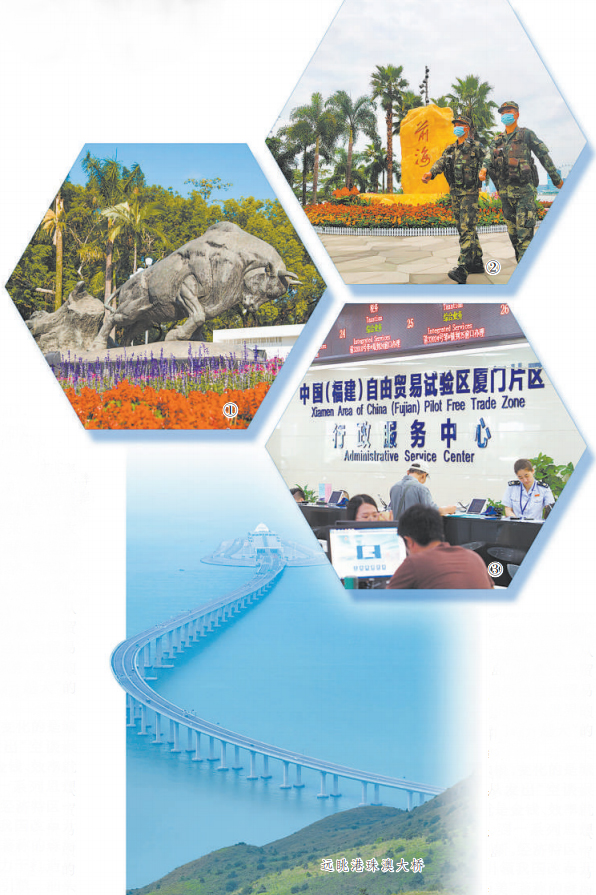 图①:深圳市委门前的“拓荒牛”雕塑。图②:武警广东总队执勤第三支队一中队驻守在深圳前海,多年来见证了前海旧貌换新颜。图为一中队哨兵在前海石公园执勤。廖 键摄。图③:当地市民在中国(福建)自由贸易试验区厦门片区行政服务中心办理业务。