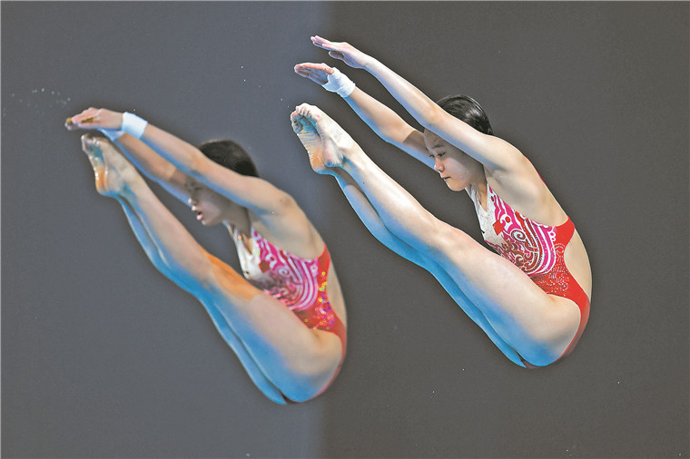 上图:9月9日,第十四届全国运动会跳水女子双人10米台决赛在西安举行。联合队组合张家齐/陈芋汐以348.96分的总成绩获得冠军。新华社发