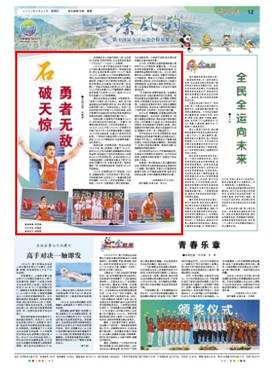 9月22日,第十四届全运会男子举重73公斤级比赛在陕西渭南举行。两届奥运冠军、浙江名将石智勇以抓举170公斤、挺举195公斤、总成绩365公斤的成绩强势夺冠。同时,他还打破自己保持的抓举和总成绩全国纪录,并超过了自己保持的世界纪录。这是石智勇在全运赛场上斩获的第二枚金牌。广西选手韦胤廷以抓举163公斤、挺举190公斤和总成绩353公斤摘得银牌,福建运动员袁程飞以抓举155公斤、挺举186公斤和总成绩341公斤获得铜牌。