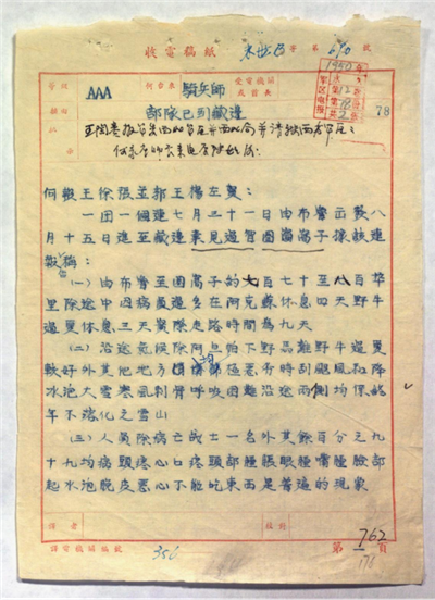 1950年8月28日,第二军独立骑兵师何家产就“部队已到藏边”致新疆军区和第二军首长电。(资料图)