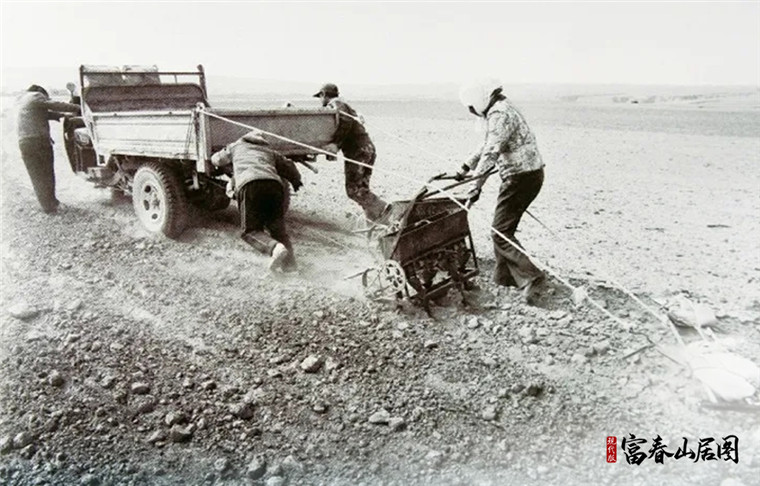 宁夏回族自治区银川市永宁县闽宁镇建设初期,移民群众在戈壁滩上开荒种田。