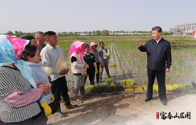 2020年6月9日,习近平在宁夏回族自治区银川市贺兰县稻渔空间乡村生态观光园,同正在劳作的村民亲切交谈。