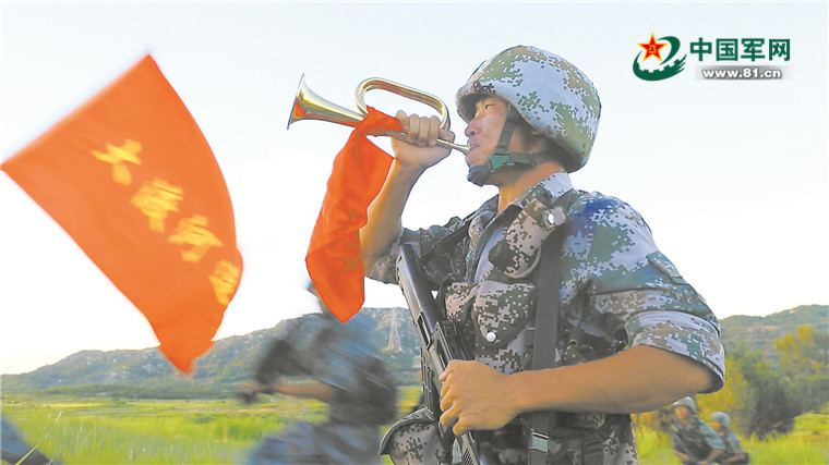 陆军第74集团军某旅“大渡河连”官兵传承发扬“大渡河精神”,争当“勇士传人”,矢志打赢,勇往直前。图为在实战化演习训练中,该连吹响冲锋号。吴俊杰摄