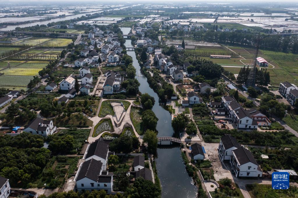 空中俯瞰浙江省嘉兴市嘉善县姚庄镇横港村(7月12日摄,无人机照片)。近年来,嘉善县建设高标准农田14.8万亩;同时建设产业帮扶联合体、农业社会化服务综合体等,不断拓宽农民增收致富渠道,走出了一条城乡深度融合推动共同富裕的实践路子。新华社记者 徐昱 摄