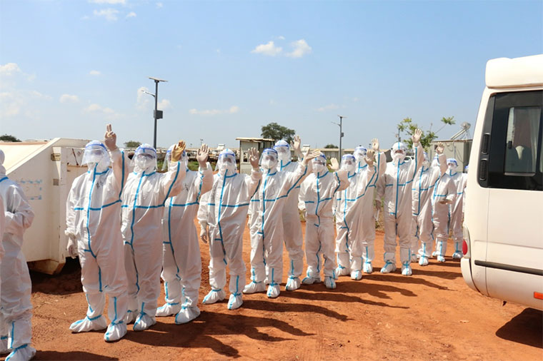 △ 11月8日,中国第二批赴阿卜耶伊维和直升机分队第二梯队官兵身着防护服进入阿卜耶伊营区。 新华社发(刘士奇摄)