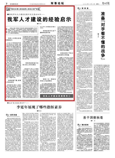 在革命、建设、改革各个历史时期,我党始终高度重视人才队伍建设,不仅创建了一支所向披靡的人民军队,培养和造就了大批杰出的军事人才,而且孕育形成了人才建设极其丰富的宝贵经验和优良传统。传承弘扬我军人才建设的丰厚精神财富,对于加强新时代军队人才建设具有重要意义。