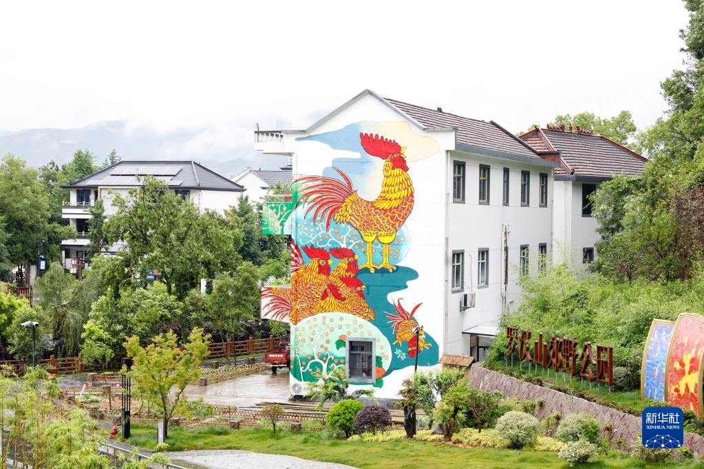 这是浙江衢州市柯城区沟溪乡余东村建筑墙壁上的农民画“大公鸡”(5月11日摄)。新华社发