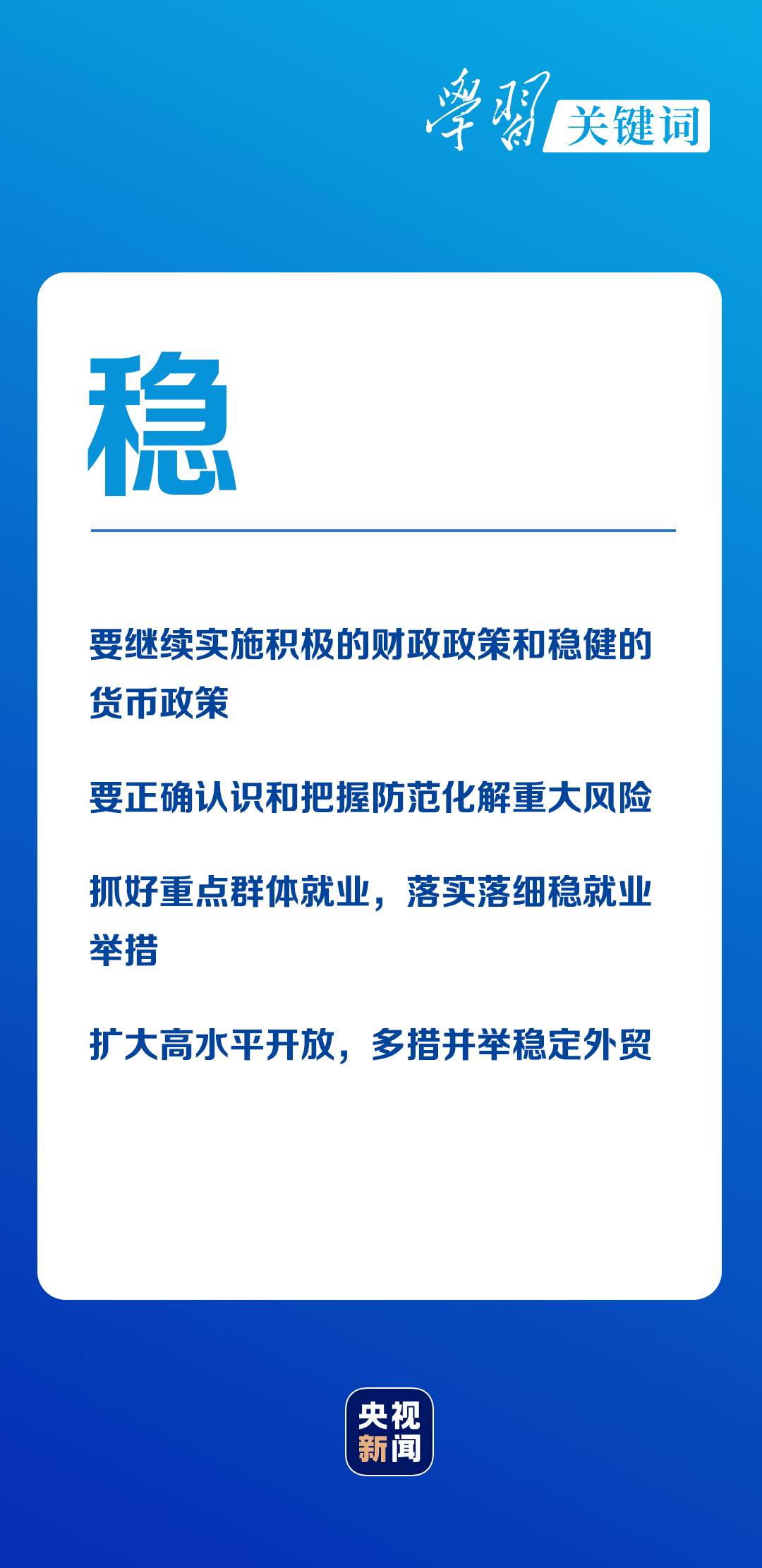 “稳”的重点是放在稳住经济运行上——稳就业、稳金融、稳外贸、稳外资,从而提振市场信心,保持经济持续健康发展和社会大局稳定,增强人民群众获得感、幸福感、安全感。